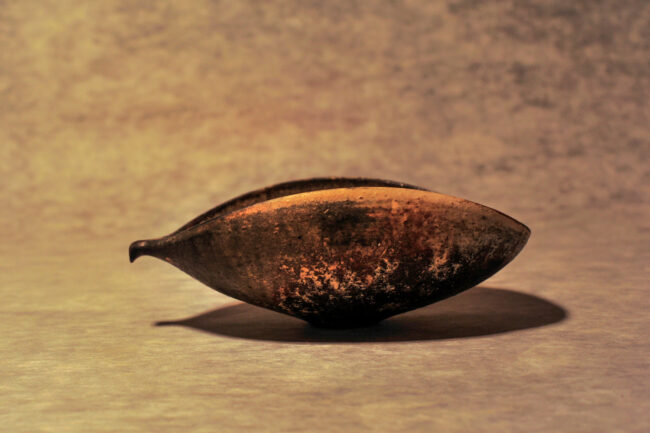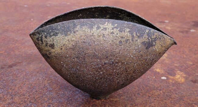 Toutes ses pièces sont fabriquées en kurinuki, parfois appelé tama-zukuri. C’est une technique traditionnelle japonaise, utilisée notamment par les potiers de raku. Mais également usitée en sculpture sur argile depuis toujours par les artistes. Il s’agit de travailler une masse pleine que l’on vient évider par la suite en plusieurs passages, au gré du séchage de la pièce.